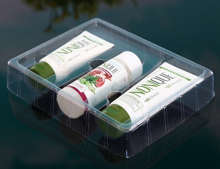 是一种起装载,隔开,支撑力,抗震,衬托出的作用的吸塑包装商品,生活中中看到的如:曲奇饼干、中秋月饼、口服液、护肤化妆品,手机包装的内外部塑料盒子,工业化生产上较常用作储存,运送零配件的塑料托盘。在食品厂、医药领域利用时,多利用绿色环保材料:HIPS,BOPS,PP和PET。